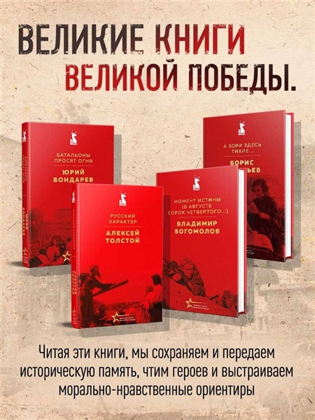 В этом году вся Россия и весь мир отмечает 80-летие Победы над фашизмом. Для каждого из нас Великая Война и память о ней — священна. К сожалению, живых свидетелей и героических участников страшных событий почти не осталось. Но у нас есть их воспоминания в книгах и фильмах военных лет. Цель серии — вспомнить главные книги победы, показать детям и подросткам важность их чтения, сохранить и передать главное слово о войне, написанное кровью и мужеством советских военных писателей.