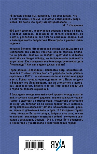 История Великой Отечественной войны складывается из миллионов эго-историй граждан нашей страны. Солдаты на фронте, рабочие на заводах, крестьяне в колхозах работали на общую победу, но воспринимали реальность по-разному. Как воспринимали блокадную реальность дети Ленинграда? Как они видели ужасы войны?Герой романа "Блокадник" — подросток Петр немногим отличался от своих сограждан – его родители были репрессированы в 1937 г. и мальчика взяли на воспитание дядя и тетя. Война застала одиннадцатилетнего Петра на даче в Борщево под Ленинградом, где он столкнулся с немецким диверсантом. Вместе с тетей Петр успевает вернуться в город до полного окружения. В блокадном городе главный герой прошел череду испытаний: в составе народной дружины тушит вражеские "зажигалки" и дежурит у бомбоубежищ, ежедневно встречается со смертью, голодает из-за кражи продуктовых карточек. Автор детально изображает детали блокадного быта, рацион, процесс добывания воды и дров. В блокадном городе гибнут близкие Петра – сестра, бабушка и ее сын, но он сам проходит тяжелейшее испытание войной, голодом и оказывается в эвакуации. Осенью 1944 г. семья Пети возвращается в Ленинград и участвует в восстановлении города.