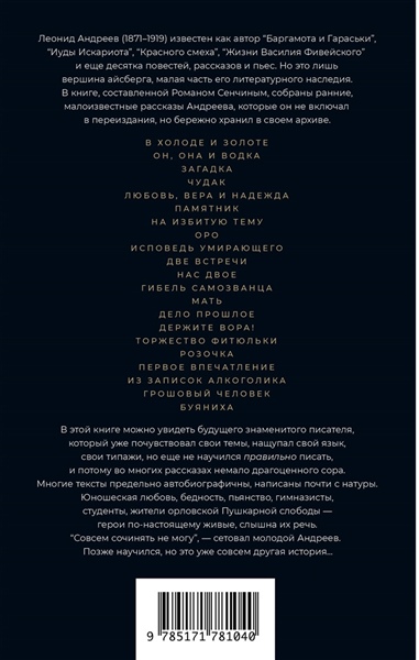 Леонид Андреев (1871–1919) известен как автор "Баргамота и Гараськи", "Иуды Искариота", "Красного смеха", "Жизни Василия Фивейского" и еще десятка повестей, рассказов и пьес. Но это лишь вершина айсберга, малая часть его литературного наследия. В томе, составленном Романом Сенчиным, собраны ранние, малоизвестные рассказы Андреева, которые он сам не включал в переиздания, но бережно хранил в своем архиве. "В этой книге можно увидеть будущего знаменитого писателя, который уже почувствовал свои темы, нащупал свой язык, свои типажи, но еще не научился правильно писать, и потому во многих рассказах немало драгоценного сора. Многие тексты предельно автобиографичны, написаны почти с натуры. Юношеская любовь, бедность, пьянство, гимназисты, студенты, жители орловской Пушкарной слободы — герои по-настоящему живые, слышна их речь. "Совсем сочинять не могу", — сетовал молодой Андреев. Позже смог научиться, но это уже совсем другая история…" (Роман Сенчин).