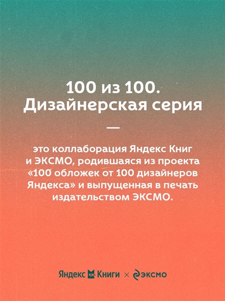 "100 из 100. Дизайнерская серия" - это коллаборация ЭКСМО и Яндекс Книг, родившаяся из проекта «100 обложек от 100 дизайнеров Яндекса». Актуальность классических текстов подчеркивается разнообразием художественных приемов в оформлении.