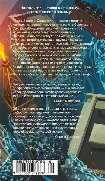 Главный герой «Свидетеля» — капитан, успевший повоевать на излёте Советского Союза, наблюдатель в мире, возникшем на обломках былой империи. Он отрешённо странствует по России и другим странам, встречает людей из прошлого, влюбляется, теряет возлюбленную, находит её, чтобы вновь потерять, и теперь уже навсегда… «Свидетель» отсылает к одной из лучших книг о Гражданской войне — «Сентиментальному путешествию» Виктора Шкловского, и война становится равноправным героем этой книги. А ещё это роман о девяностых — времени не только большого подъёма, но и великой растерянности. Это книга об эпохе, успевшей превратиться в миф.
