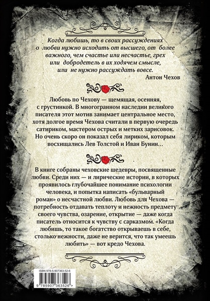 В этой книге впервые собраны чеховские шедевры, посвященные любви. Среди них — грустные лирические истории, в которых проявилось глубочайшее понимание психологии человека, и язвительные сюжеты, и попытка написать «бульварный роман» о несчастной любви — «Драма на охоте». Но эти очень разные повести и рассказы многое объединяет. Любовь для Чехова — это, прежде всего, потребность отдавать теплоту и нежность предмету своего чувства. Это всегда озарение, открытие — даже когда писатель относится к чувству со свойственным ему сарказмом. «Когда любишь, то такое богатство открываешь в себе, столько нежности, ласковости, даже не верится, что так умеешь любить», — кредо всемирно известного русского классика.