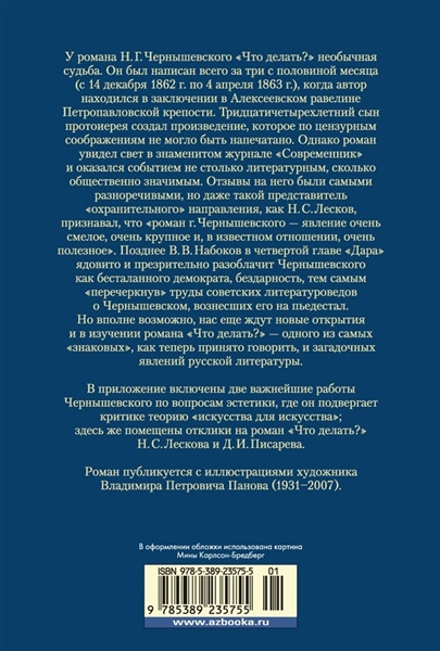 Роман Н. Г. Чернышевского «Что делать?» — одно из самых неоднозначных произведений русской литературы. Роман увидел свет в 1863 году и сразу же вызвал бурную полемику: от резко отрицательных отзывов литераторов консервативного толка до восторгов в кругу революционно настроенной молодежи. По воспоминаниям современников, не было студента или даже гимназиста, не читавшего «Что делать?». В советскую эпоху Чернышевский занял почетное место на литературном олимпе, а его главное произведение вошло в обязательную школьную программу. Сегодня обращение к роману «Что делать?» заставляет заново переосмыслить его значение в истории русской литературы и общественной жизни. В приложение включены две важнейшие работы Чернышевского по вопросам эстетики, где он подвергает критике теорию «искусства для искусства»; здесь же помещены отклики на роман «Что делать?» Н. С. Лескова и Д. И. Писарева. Роман публикуется с иллюстрациями художника Владимира Петровича Панова (1931–2007).