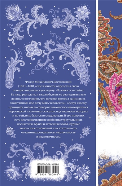 Федор Михайлович Достоевский (1821—1881) еще в юности определил свою главную писательскую задачу: «Человек есть тайна. Ее надо разгадать, и ежели будешь ее разгадывать всю жизнь, то не говори, что потерял время; я занимаюсь этой тайной, ибо хочу быть человеком». Следуя своему принципу, писатель сотворил множество многогранных персонажей и сложных сюжетов, над анализом которых и по сей день бьются исследователи. В его повестях есть всё: таинственные любовные треугольники, несчастные браки и затаенная злоба, бурные выяснения отношений и мечтательность отчаянных романтиков, жертвенность и деспотичность.