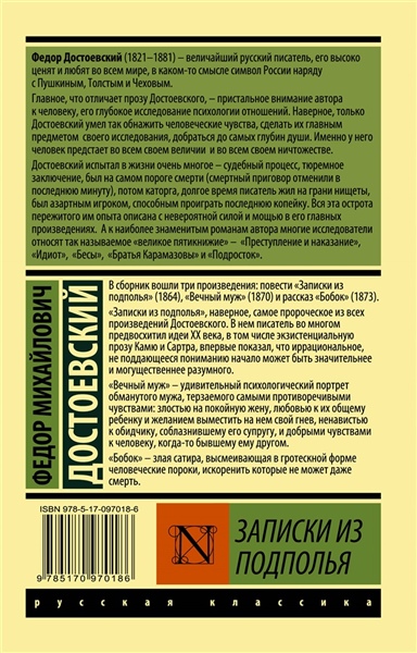В сборник вошли три произведения: повести "Записки из подполья" (1864), "Вечный муж" (1870) и рассказ "Бобок" (1873). "Записки из подполья", наверное, самое пророческое из всех произведений Достоевского. В нем писатель во многом предвосхитил идеи ХХ века, в том числе прозу Камю и Сартра, впервые показал, что иррациаональное, не поддающееся пониманию начало может быть значительнее и могущественнее разумного. "Вечный муж" — удивительный психологический портрет обманутого мужа, терзаемого самыми противоречивыми чувствами: злостью на покойную жену, любовью к их общему ребенку и желанием выместить на нем свой гнев, ненавистью к обидчику, соблазнившему его супругу, и добрыми чувствами к человеку, когда-то бывшему ему другом. "Бобок" — злая сатира, высмеивающая в гротескной форме человеческие пороки, искоренить которые не может даже смерть.