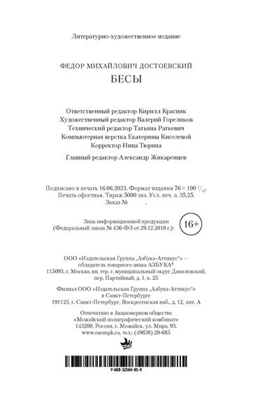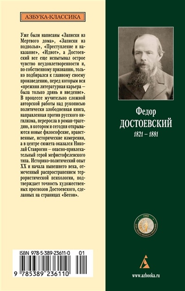 Уже были написаны Записки из Мертвого дома, Записки из подполья, Преступление и наказание, Идиот, а Достоевский все еще испытывал острое чувство неудовлетворенности и, по собственному признанию, только подбирался к главному своему произведению, перед которым вся прежняя литературная карьера была только дрянь и введение. Однако в политической жизни России случилось нечто, заставившее Достоевского изменить свои литературные планы и приступить к созданию романа с вызывающим и символичным названием Бесы. Спиралеобразное развитие истории вообще и российской истории в частности позволяет думать, что роман Достоевского Бесы будет интересен новым поколениям читателей не только как шедевр классической литературы.