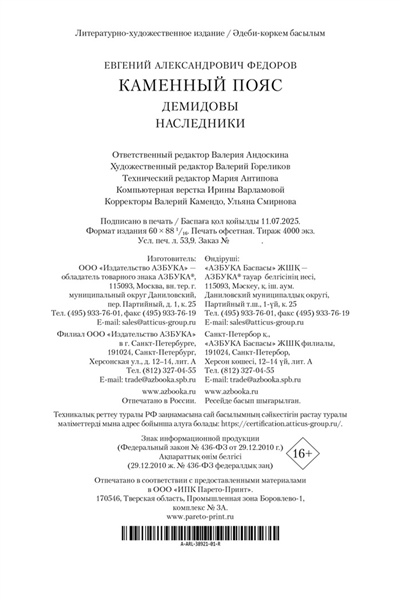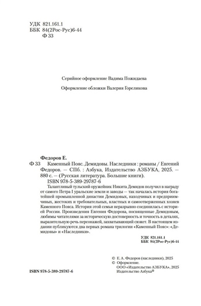 Талантливый тульский оружейник Никита Демидов получил в награду от самого Петра I уральские земли и заводы — так началась история богатейшей промышленной династии Демидовых, находчивых и предприимчивых, жестоких и требовательных, властных и самоотверженных хозяев Каменного Пояса. История этой семьи неразрывно соединилась с историей России. Произведения Евгения Федорова, посвященные Демидовым, любимы читателями за историческую достоверность и точность в деталях, выразительную речь персонажей, захватывающий сюжет. В настоящем издании публикуются два первых романа трилогии «Каменный Пояс»: «Демидовы» и «Наследники».