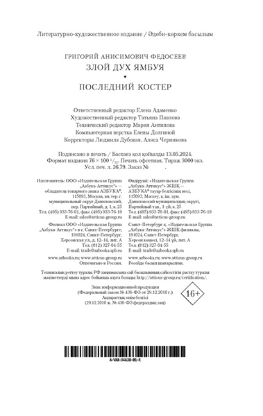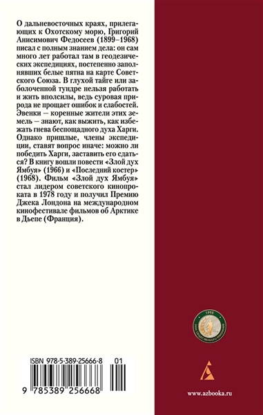 Григорий Анисимович Федосеев (1899–1968) писал о дальневосточных краях, прилегающих к Охотскому морю, с полным знанием дела: он сам много лет работал там в геодезических экспедициях, постепенно заполнявших белые пятна на карте Советского Союза.В тайге или заболоченной тундре нельзя работать и жить вполсилы, ведь суровая природа не прощает ошибок и слабостей. Эвенки — коренные жители этих земель — знают, как выжить, как избежать гнева беспощадного духа Харги. Однако пришлые, члены экспедиции, ставят вопрос иначе: можно ли победить Харги, заставить его сдаться? В книгу вошли повести «Злой дух Ямбуя» (1966) и «Последний костер» (1968). Фильм «Злой дух Ямбуя» стал лидером советского кинопроката в 1978 году и получил Премию Джека Лондона на международном кинофестивале фильмов об Арктике в Дьепе (Франция).