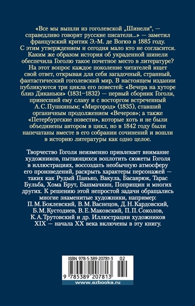 «Все мы вышли из гоголевской „Шинели“, — справедливо говорят русские писатели… » — заметил французский критик Э.-М. де Вогюэ в 1885 году. С этим утверждением и сегодня мало кто не согласится. Каким же образом история об украденной шинели обеспечила Гоголю такое почетное место в литературе? На этот вопрос каждое поколение читателей ищет свой ответ, открывая для себя загадочный, странный, фантастический гоголевский мир. В настоящем издании публикуются три цикла его повестей: «Вечера на хуторе близ Диканьки» (1831–1832) — первый сборник Гоголя, принесший ему славу и с восторгом встреченный А. С. Пушкиным; «Миргород» (1835), ставший органичным продолжением «Вечеров»; а также «Петербургские повести», которые, хоть и не были объединены автором в цикл, но в 1842 году были напечатаны вместе в его собрании сочинений и вошли в историю литературы как одно целое. В издание включены иллюстрации художников XIX — начала ХХ века: П. М. Боклевского, В. М. Васнецова, Д. Н. Кардовского, Б. М. Кустодиева, В. Е. Маковского, П. П. Соколова, К. А. Трутовского и др.