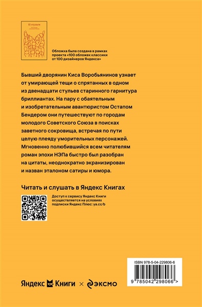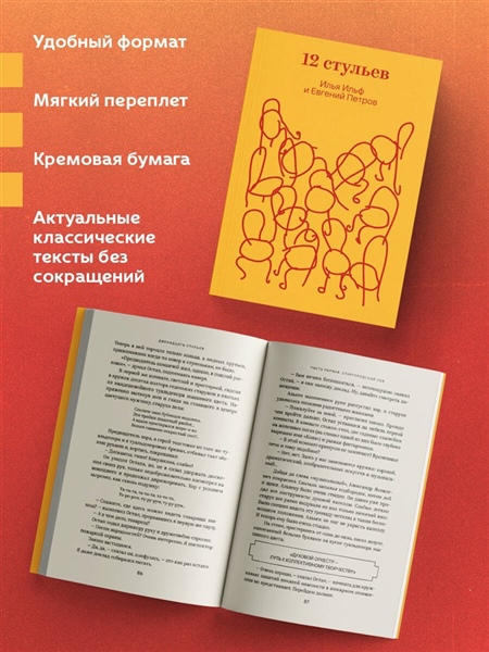 Бывший дворянин Киса Воробьянинов узнает от умирающей тещи о спрятанных в одном из двенадцати стульев старинного гарнитура бриллиантах. На пару с обаятельным и изобретательным авантюристом Остапом Бендером они путешествуют по городам молодого Советского Союза в поисках заветного сокровища, встречая по пути целую плеяду уморительных персонажей. Мгновенно полюбившийся всем читателям роман эпохи НЭПа быстро был разобран на цитаты, неоднократно экранизирован и назван эталоном сатиры и юмора.