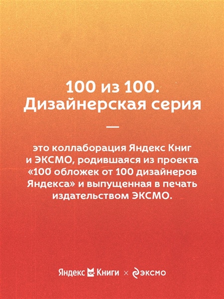 "100 из 100. Дизайнерская серия" - это коллаборация ЭКСМО и Яндекс Книг, родившаяся из проекта «100 обложек от 100 дизайнеров Яндекса». Актуальность классических текстов подчеркивается разнообразием художественных приемов в оформлении.
