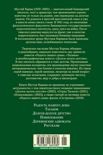 Мустай Карим (1919–2005) — замечательный башкирский писатель, поэт и драматург, чьи произведения хорошо известны не только на родине: они переведены на десятки языков. Творческое наследие Карима обширно и разнообразно, широкую известность ему принесли повести «Радость нашего дома», «Таганок» и автобиографическая повесть «Долгое-долгое детство». В них писатель обращается к теме детства. Пропитанные национальным колоритом, эти произведения звучат поистине интернационально, они близки и понятны каждому. Их герои, порой наивные, порой смешные, несмотря на юный возраст и тяжелые испытания, сохраняют душевную чистоту, достоинство, веру в добро и милосердие.