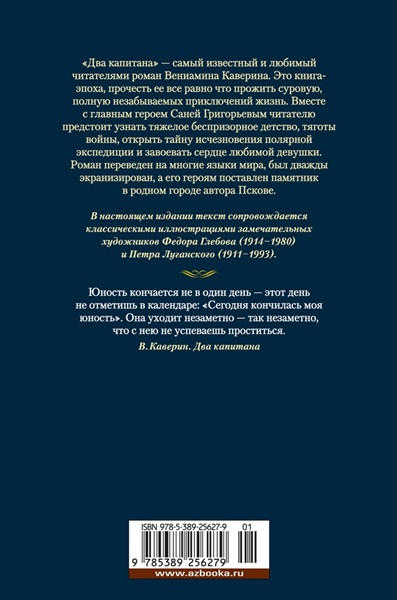 «Два капитана» — самый известный и любимый читателями роман Вениамина Каверина. Это книга-эпоха, прочесть ее — все равно что прожить суровую, полную незабываемых приключений жизнь. Вместе с главным героем Саней Григорьевым читателю предстоит пережить тяжелое беспризорное детство, тяготы войны, открыть тайну исчезновения полярной экспедиции и завоевать сердце любимой девушки. Роман переведен на многие языки мира, был дважды экранизирован, а его героям поставлен памятник в родном городе автора, Пскове. В настоящем издании текст сопровождается классическими иллюстрациями замечательных художников Федора Глебова (1914–1980) и Петра Луганского (1911–1993).