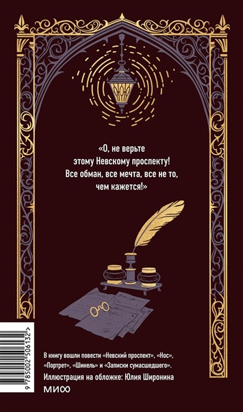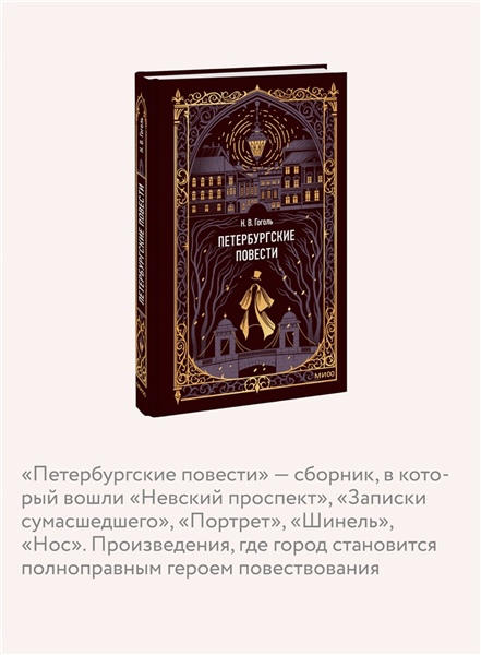 Повести Н.В. Гоголя, которые объединены общим местом действия — Санкт-Петербургом В сборник вошли повести «Невский проспект», «Записки сумасшедшего», «Портрет», «Шинель», «Нос» Классика в элегантном оформлении Юлии Широниной