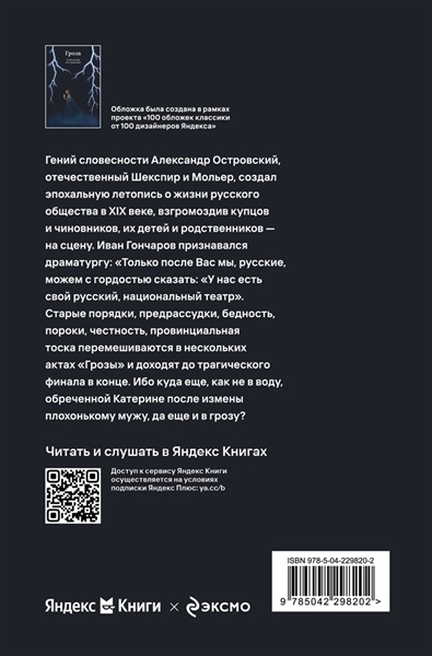 Гений словесности Александр Островский, отечественный Шекспир и Мольер, создал эпохальную летопись о жизни русского общества в XIX веке, взгромоздив купцов и чиновников, их детей и родственников — на сцену. Иван Гончаров признавался драматургу: «Только после Вас мы, русские, можем с гордостью сказать: "У нас есть свой русский, национальный театр"». Старые порядки, предрассудки, бедность, пороки, честность, провинциальная тоска перемешиваются в нескольких актах «Грозы» и доходят до трагического финала в конце. Ибо куда еще, как не в воду, обреченной Катерине после измены плохонькому мужу, да еще и в грозу?