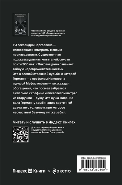 У Александра Сергеевича - "говорящие" эпиграфы к своим произведениям. Существенная подсказка для нас, читателей, спустя почти 200 лет: "Пиковая дама означает тайную недоброжелательность" - это о слепой страшной судьбе, с которой Германн с профилем Наполеона, а душой – Мефистофеля так жаждал обогащения, что посмел забраться в спальню к графине и пистолетом вытряс из старушки – душу. Эта душа-видение дала Германну комбинацию карточной удачи, но с условием, про которое несчастный безумец тут же забыл.