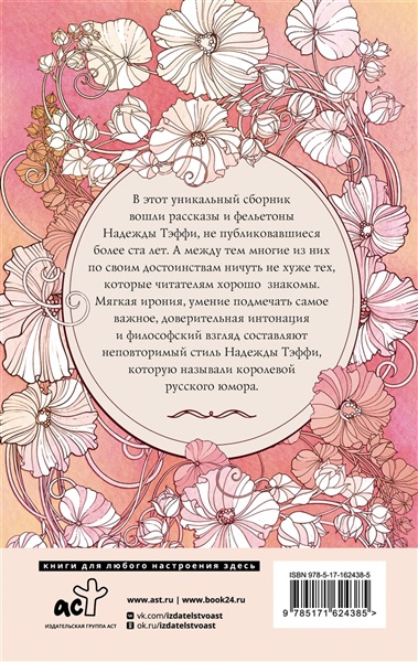 В этот уникальный сборник вошли рассказы и фельетоны Надежды Тэффи, не публиковавшиеся более ста лет. А между тем многие из них по своим достоинствам ничуть не хуже тех, которые читателям хорошо знакомы. Мягкая ирония, умение подмечать самое важное, доверительная интонация и философский взгляд составляют неповторимый стиль Надежды Тэффи, которую называли королевой русского юмора.