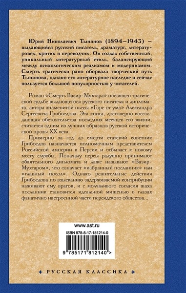 Роман "Смерть Вазир-Мухтара" посвящен трагической судьбе выдающегося русского писателя и дипломата, автора знаменитой пьесы "Горе от ума" Александра Сергеевича Грибоедова. Эта книга, достоверно воссоздающая обстоятельства последних месяцев его жизни, считается одним из лучших образцов русской исторической прозы XX века.
