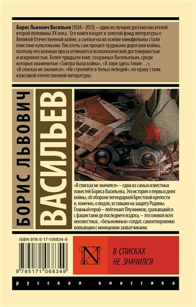 "В списках не значился" — одна из самых известных повестей Бориса Васильева. Это история о первых днях войны, об обороне легендарной Брестской крепости и, конечно, о людях, вставших на защиту Родины. Главный герой — лейтенант Плужников, сражавшийся с фашистами до последнего вздоха, — это символ всех неизвестных, "безымянных" солдат, самоотверженно воевавших с немецкими захватчиками.