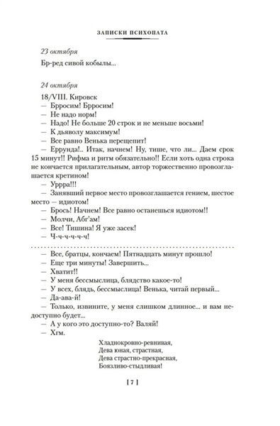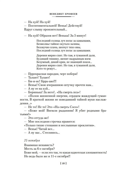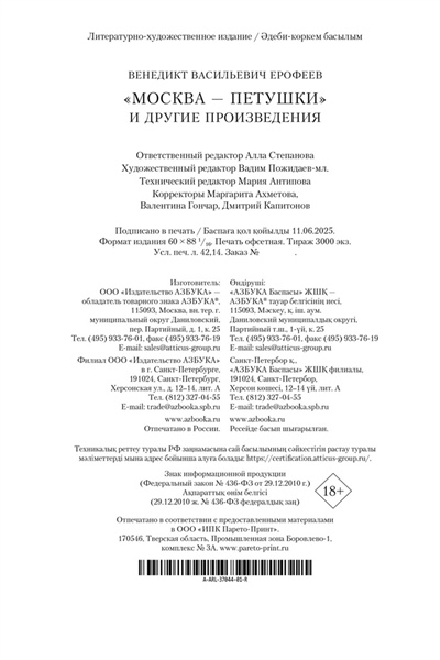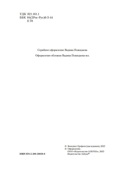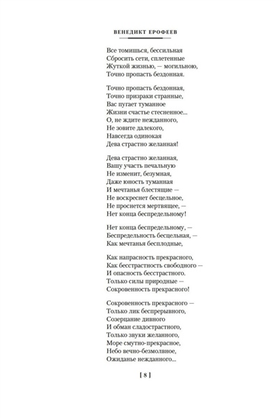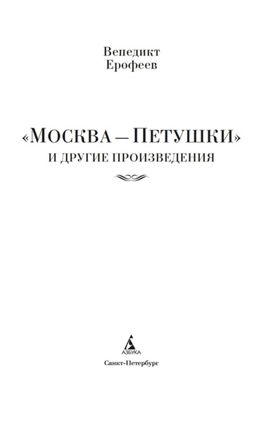 Всемирную славу Венедикту Ерофееву принесла его знаменитая, переведенная более чем на тридцать языков поэма «Москва — Петушки». И хотя ее герой — Веничка — так и не увидел Красной площади, зато стал поистине народным, а сам автор теперь уже признан классиком русской литературы ХХ века. Однако творческое наследие Ерофеева — это не только поэма «Москва — Петушки», это и «Записки психопата» (1956–1958), начатые в 17-летнем возрасте, и пьеса «Вальпургиева ночь» (часть задуманной автором, но неосуществленной трилогии под общим названием «Драй Нэхте»), и так называемые произведения малой прозы, включая сочинение, написанное на вступительных экзаменах в институт, и краткая автобиография. Все это, а также фрагменты из записных книжек, которые Венедикт Ерофеев вел с конца 1950-х годов, и небольшой текст — воспоминание о поступлении во Владимирский пединститут, вошло в настоящее издание, которое станет прекрасным подарком для поклонников писателя.