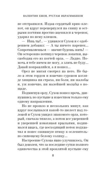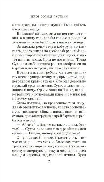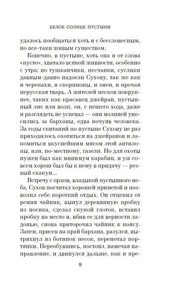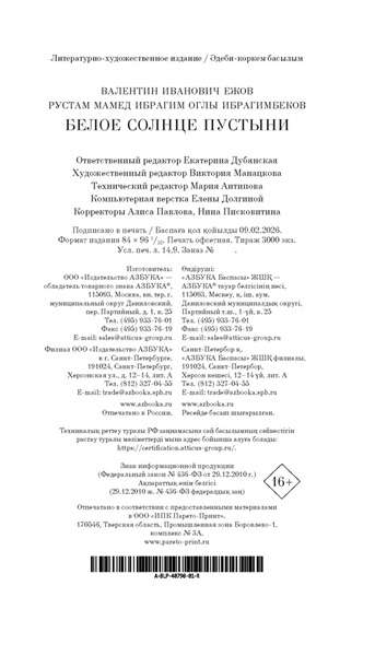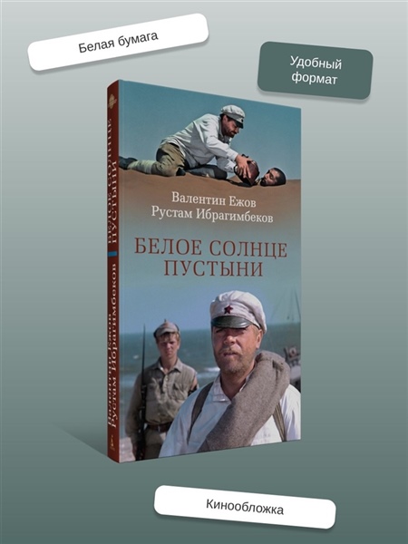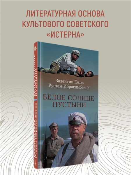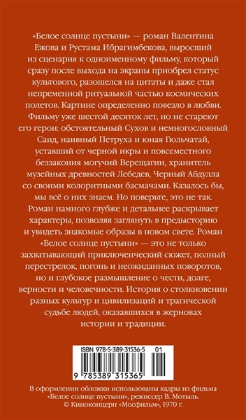 «Белое солнце пустыни» — роман Валентина Ежова и Рустама Ибрагимбекова, выросший из сценария к одноименному фильму, который сразу после выхода на экраны приобрел статус культового, разошелся на цитаты и даже стал непременной ритуальной частью космических полетов. Картине определенно повезло в любви. Фильму уже шестой десяток лет, но не стареют его герои: обстоятельный Сухов и немногословный Саид, наивный Петруха и юная Гюльчатай, уставший от черной икры и повсеместного беззакония могучий Верещагин, хранитель музейных древностей Лебедев, Черный Абдулла со своими колоритными басмачами. Казалось бы, мы всё о них знаем. Но поверьте — это не так. Роман намного глубже и детальнее раскрывает характеры, позволяя заглянуть в предысторию и увидеть знакомые образы в новом свете. Роман «Белое солнце пустыни» — это не только захватывающий приключенческий сюжет, полный перестрелок, погонь и неожиданных поворотов, но и глубокое размышление о чести, долге, верности и человечности. История о столкновении разных культур и цивилизаций и трагической судьбе людей, оказавшихся в жерновах истории и традиции.