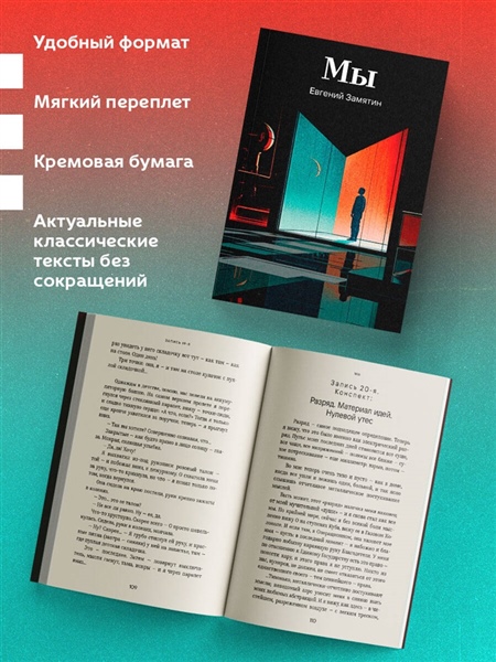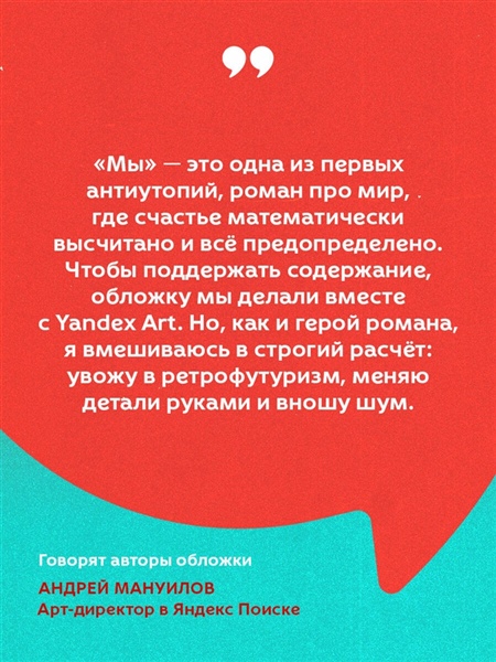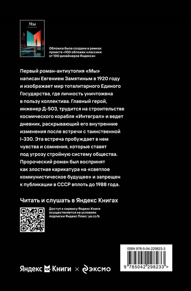Первый роман-антиутопия «Мы» написан Евгением Замятиным в 1920 году и описывает мир тоталитарного Единого Государства, где личность уничтожена в пользу коллектива. Главный герой, инженер Д-503, трудится на строительстве космического корабля «Интеграл» и ведёт дневник, раскрывающий его внутренние изменения после встречи с таинственной I-330. Эта встреча пробуждает в нём чувства и сомнения, которые ставят под угрозу стройную систему общества. Пророческий роман был воспринят как злостная карикатура на «светлое коммунистическое будущее» и запрещен к публикации в СССР вплоть до 1988 года. "100 из 100. Дизайнерская серия" - это коллаборация ЭКСМО и Яндекс Книг, родившаяся из проекта «100 обложек от 100 дизайнеров Яндекса». Актуальность классических текстов подчеркивается разнообразием художественных приемов в оформлении. Удобный формат. Мягкий переплет. Кремовая бумага.