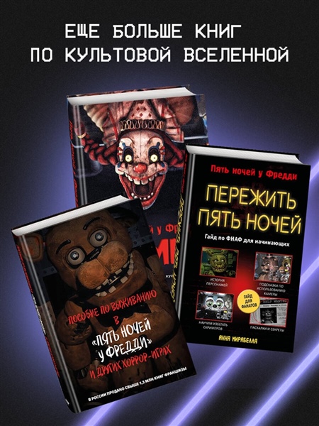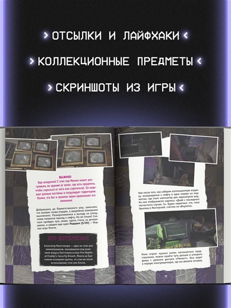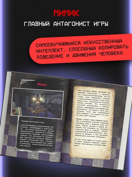 Новинка в культовой вселенной FNAF — гайд по прохождению игры «Five Nights at Freddy’s: Secret of the Mimic».Абсолютно новая информация в эксклюзивном подробном руководстве. Потрясающий подарок фанатам вселенной, а также любителям хорроров! Вся правда о создании первых аниматроников: узнайте, как всё начиналось, и почувствуйте истоки игровой вселенной! «Five Nights at Freddy’s: Secret of the Mimic» отправляет нас в самое начало кошмара, задолго до событий первой части франшизы. Погрузитесь в атмосферу конца 70-х годов. Исследуйте заброшенную «Костюмированную Мастерскую Мюррея» от лица техника Арнольда, отправленного туда корпорацией «Развлечения Фазбер» с одной лишь целью: добыть чертежи уникального, возможно, самого опасного аниматроника. Что же скрывается в гниющих стенах этой забытой фабрики? Какая трагедия постигла семью Эдвина Мюррея? Как зарождались первые, теперь уже зловещие, аниматроники? И, главное — кто на самом деле такой Мимик? Все ответы, полный гайд по прохождению, все секреты, хитроумные подсказки и неочевидные отсылки ждут вас на страницах этого руководства. В сопровождении подробных скриншотов мы раскроем тайну, которую хранит Мимик! Такого вы нигде больше не найдёте!