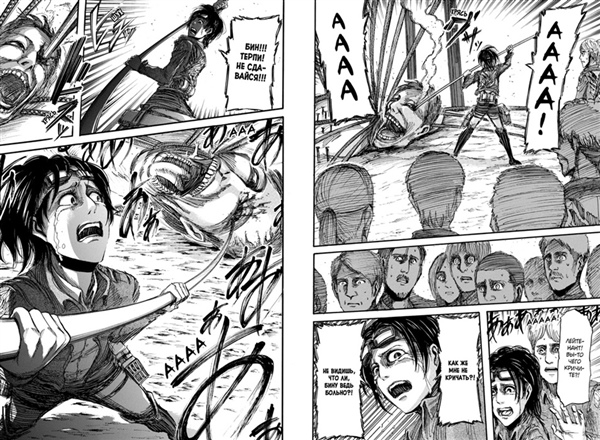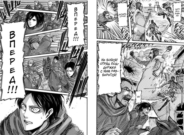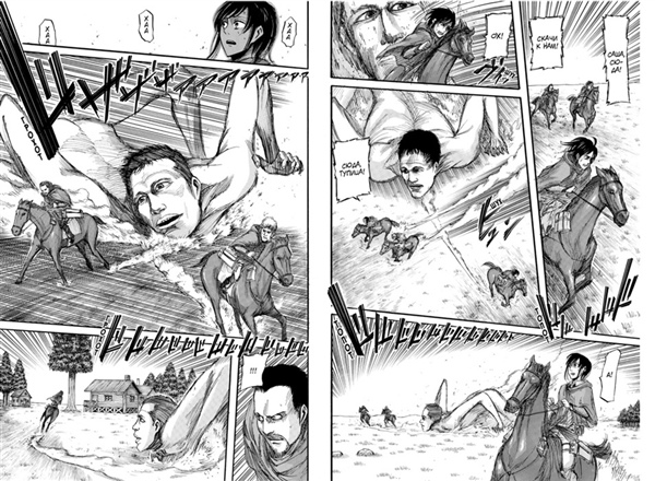 В экспедиции участвуют и верные друзья Эрена, Армин и Микаса. Сначала все идет более или менее гладко, но внезапно появляется невероятно быстрая женщина-титан и атакует отряд...
