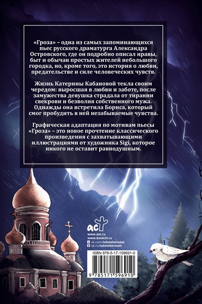 Однако теперь события в тихом городке на Волге под названием Калинов разворачиваются на страницах графического романа. Противостояние молодой Катерины, жаждущей любви и свободы, и местных самодуров во главе с Кабанихой и Диким ярко визуализированы художником SIGI.