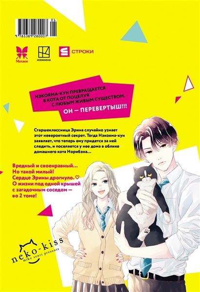 Нэкояма-кун превращается в кота при поцелуе с любым живым существом. Он — перевертыш! Старшеклассница Эрина случайно узнает этот невероятный секрет. Тогда Нэкояма-кун заявляет, что теперь ему придется за ней следить, — и поселяется у неё дома в облике домашнего кота Норибэна… Вредный и своенравный… Но такой милый! Сердце Эрины дрогнуло. Жизнь под одной крышей с загадочным соседом — во втором томе!