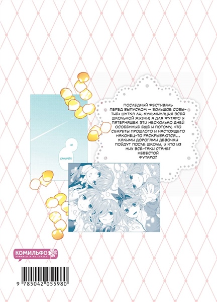 Финальный том серии! К каждому экземпляру первого тиража в подарок брачный сертификат. Последний фестиваль перед выпуском – большое событие: шутка ли, кульминация всей школьной жизни! А для Футаро и пятерняшек эти несколько дней особенные ещё и потому, что секреты прошлого и настоящего наконец-то раскрываются... Какими дорогами девочки пойдут после школы, и кто из них всё-таки станет невестой Футаро?