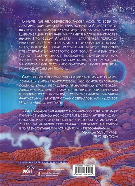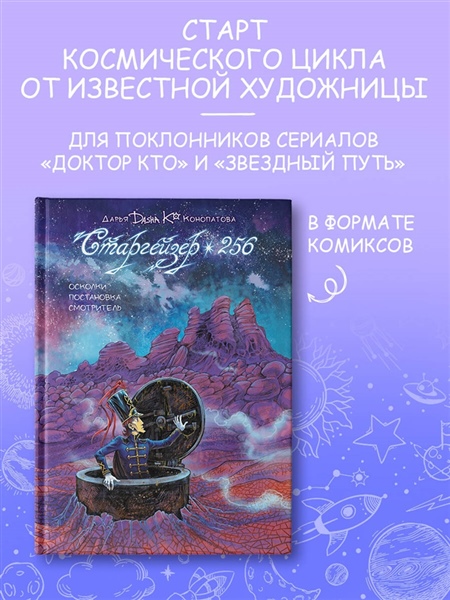 В мире, где человечество расселилось по всей галактике, одинокий странник по имени Альберт путешествует между звёздами, ищет следы исчезнувших цивилизаций, пьёт чаёк на планете иллюзий и спасает жизни. Профессия Альберта — старгейзер, порядковый номер 256. А это значит, что он прилетает на планеты, которым грозит разрушение и ищет способы предотвратить катастрофу. Вот только жители этих планет воспринимают появление старгейзера как дурной знак и ставят ему палки в колёса, не зная, что на самом деле этот "космо-гусар" делает всё возможное, чтобы им помочь. Старт нового космического цикла от известной художницы Дарьи Конопатовой. Под одной обложкой собрано сразу несколько приключений старгейзера Альберта, которые придутся по вкусу поклонникам европейского комикса, оптимистичной научной фантастики и зрителям таких сериалов, как "Доктор Кто" и "Звёздный путь".