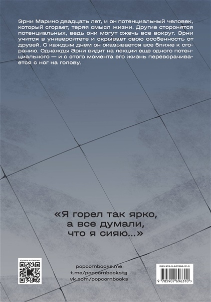 Эрни Марино — двадцать лет, и он — потенциальный, человек, который сгорает, теряя смысл жизни. Другие сторонятся потенциальных, ведь они могут сжечь все вокруг. Эрни учится в университете и скрывает свою особенность от друзей. С каждым днем он оказывается все ближе к сгоранию: сначала появляются приступы удушья, затем начинают тлеть руки и, в конце концов, человек сгорает. Однажды Эрни видит на лекции еще одного потенциального — и с этого момента его жизнь переворачивается с ног на голову.