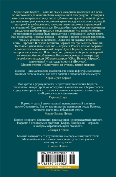 Хорхе Луис Борхес — один из самых известных писателей ХХ века, во многом определивший облик современной литературы. Всемирная известность пришла к нему после публикации художественной прозы, удивительных рассказов, стирающих грань между вымыслом и правдой, историей и воображением, литературным текстом и окружающей нас вселенной. Однако язык для Борхеса был «способом упорядочивать загадочное изобилие мира», и неудивительно, что именно поэзия, по его мнению, должна была справляться с этой задачей лучше всего. Как писал автор, «всякая поэзия — загадка; и никто не знает наверняка, что ему уготовано написать». Хотя что он называл поэзией, а что — прозой? В случае великого Борхеса эта грань очень размыта. Настоящее уникальное издание — первое в России полное собрание «поэтических» произведений Хорхе Луиса Борхеса, составленное автором на склоне лет. В него вошли тринадцать сборников, первый из которых был опубликован Борхесом в двадцать четыре года за свой счет тиражом 300 экземпляров («Жар Буэнос-Айреса»), а последний — за год до смерти («Порука»). Многие тексты публикуются на русском языке впервые.