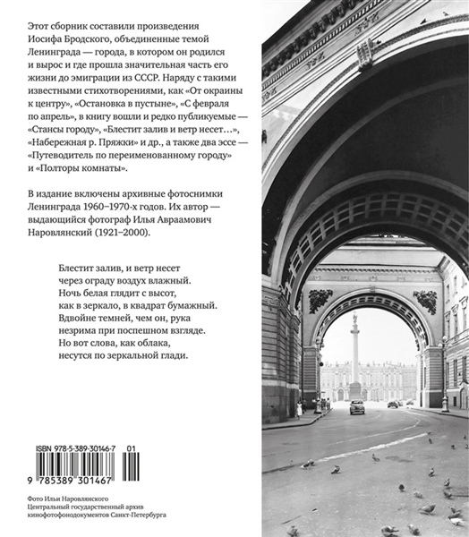 Этот сборник составили произведения Иосифа Бродского, объединенные темой Ленинграда — города, в котором он родился и вырос и где прошла значительная часть его жизни до эмиграции из СССР. Наряду с такими известными стихотворениями, как «От окраины к центру», «Остановка в пустыне», «С февраля по апрель», в книгу вошли и редко публикуемые — «Стансы городу», «Блестит залив и ветр несет…», «Набережная р. Пряжки» и др., а также два эссе — «Путеводитель по переименованному городу» и «Полторы комнаты». В издание включены архивные фотоснимки Ленинграда 1960–1970-х годов. Их автор — выдающийся фотограф Илья Авраамович Наровлянский (1921–2000).