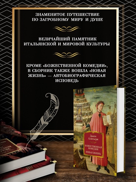 «Божественная комедия» — величайшее произведение Данте Алигьери, поэтическая вселенная, в которой путь человеческой души проходит через Ад, Чистилище и Рай — от мрака греха к свету истины и любви. Это не только религиозно-философская поэма, но и глубокое размышление о природе человека, ответственности, свободе воли и предназначении. Дополняет том «Новая жизнь» — один из первых европейских автобиографических романов XIII века, лирическое произведение в стихах и прозе, рассказывающее о духовном становлении Данте и его любви к Беатриче, одной из самых возвышенных фигур в истории мировой литературы. Это редкий случай текста, который одновременно является художественным шедевром, философским трактатом и духовным путеводителем. Данте создал стройную и поражающую воображение картину мироздания, где каждая деталь наполнена смыслом, а личное переживание становится универсальным. «Божественная комедия» продолжает говорить с читателем спустя века — о страхе, вине, надежде, любви и преодолении. «Новая жизнь» же позволяет увидеть истоки этого пути: интимные, хрупкие, почти дневниковые размышления молодого поэта. Понравится тем, кто ценит великую классику и готов к вдумчивому, медленному чтению. Книга будет близка читателям Гёте, Мильтона, Вергилия, а также тем, кого привлекают философские и символические тексты, в которых поэзия соединяется с размышлением о судьбе человека. Особенно откликнется тем, кто ищет в литературе не только сюжет, но и внутренний путь. Данте Алигьери — итальянский поэт, мыслитель и политический деятель, один из основоположников итальянского литературного языка. Его творчество стало мостом между Средневековьем и Возрождением. «Божественная комедия» — итог всей его жизни, опыта изгнания, размышлений о вере, справедливости и любви. Влияние Данте на европейскую культуру невозможно переоценить: его поэма на века определила развитие литературы, философии и художественного мышления.