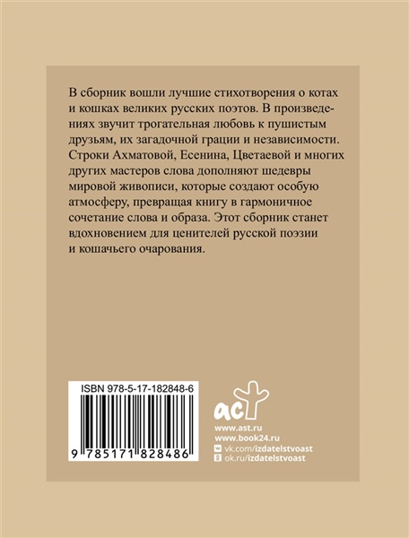 В сборник вошли лучшие стихотворения о котах и кошках великих русских поэтов. В произведениях звучит трогательная любовь к пушистым друзьям, их загадочной грации и независимости. Строки Ахматовой, Есенина, Цветаевой и многих других мастеров слова дополняют шедевры мировой живописи, которые создают особую атмосферу, превращая книгу в гармоничное сочетание слова и образа. Этот сборник станет вдохновением для ценителей русской поэзии и кошачьего очарования.