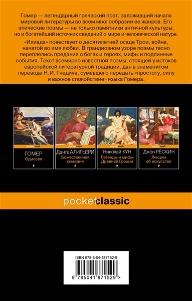 Гомер заложил начала мировой литературы, все многообразие ее жанров. Его "Илиада" и "Одиссея" - не только памятники античной культуры, но и богатейший источник сведений о мире и человеческой натуре. "Илиада" повествует об одном из поворотных моментов истории Древней Греции, десятилетней осаде Трои, войне, начатой во имя любви. Здесь тесно переплелись предания о богах и героях, мифы и подлинные события. Текст всемирно известной поэмы, стоящей у истоков европейской литературной традиции, дан в знаменитом переводе Н.И.Гнедича, сумевшего передать "простоту, силу и важное спокойствие" языка Гомера.
