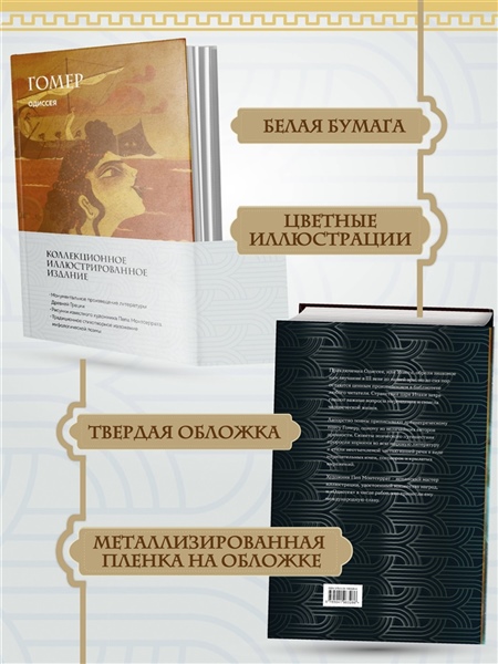 Ранее не выходившие в России иллюстрации лауреата Национальной премии в области иллюстрации (Premio Nacional de Ilustración) Пепы Монтсеррата! Одиссей, Улисс, царь Итаки, «городов сокрушитель» — легендарный персонаж со множеством имён, приписываемых руке не менее легендарного автора, останется в истории, кажется, уже навсегда. «Одиссея» — это не просто эпос о дальних путешествиях, наполненных чудесами и магией. Это рассказ о человеке, который сталкивается с трудностями, но не сдаётся. Как быть сильным, когда весь мир против тебя? Как сохранить верность своим принципам, несмотря на соблазны и опасности? Эти вопросы актуальны в любую эпоху. Удивительные работы испанского художника Пепы Монтсеррата добавляют яркие детали и образность к захватывающим событиям гомеровского текста. Классический перевод на русский язык выполнен Василием Жуковским. Издание в твёрдом переплёте. Полусупер. Металлизированная плёнка на обложке. Изысканное стильное оформление. Белая бумага. Чёткий, удобный для чтения шрифт. Цветные иллюстрации. Серия книг «Время для классики» — это выдающиеся произведения мировой литературы в выразительном, стильном оформлении. Открываете вы книгу впервые или хотите ещё раз перечитать знакомые строки — в любом случае вас ждёт встреча с самим собой. «Время для классики» — это время для себя: для своих желаний, надежд, впечатлений и воспоминаний. Проведите его с удовольствием!