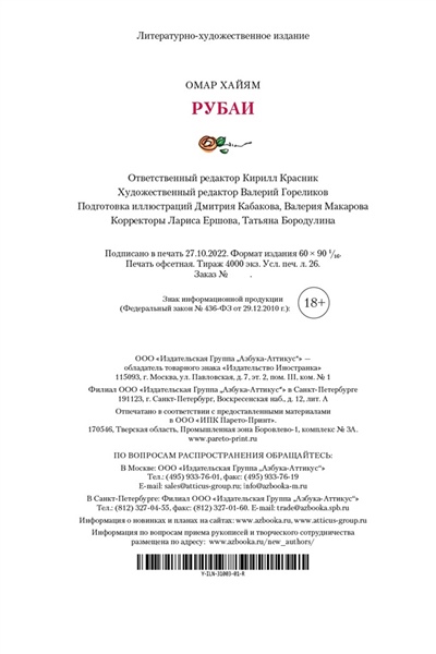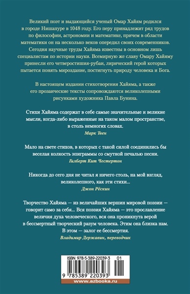Великий поэт и выдающийся ученый Омар Хайям родился в городе Нишапуре в 1048 году. Его перу принадлежит ряд трудов по философии, астрономии и математике, причем в области математики он на несколько веков опередил своих современников. Сегодня научные труды Хайяма известны в основном лишь специалистам по истории науки. Всемирную же славу Омару Хайяму принесли его четверостишия-рубаи, лирический герой которых пытается понять мироздание, постигнуть природу человека и Бога. В настоящем издании стихотворения Хайяма, а также его прозаические тексты сопровождаются великолепными рисунками художника Павла Бунина.