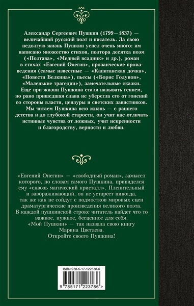 "Евгений Онегин" – "свободный роман", замысел которого, по словам самого Пушкина, привиделся ему "сквозь магический кристалл". Пленительный и завораживающий, он не устареет никогда, так же как не сойдут с подмостков мировых сцен драматургические произведения великого поэта. В каждой пушкинской строке читатель найдет что-то важное, нужное, бесценное для себя. "Мой Пушкин" – так назвала свою книгу Марина Цветаева. Откройте своего Пушкина!