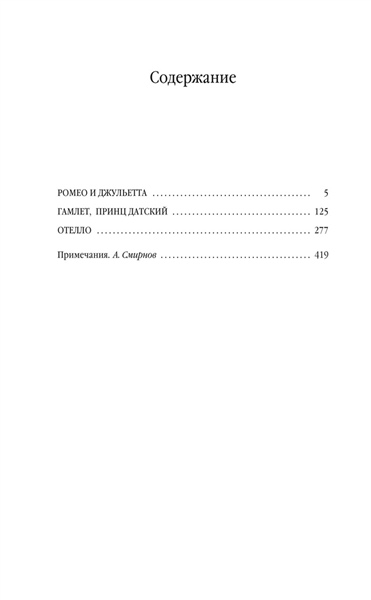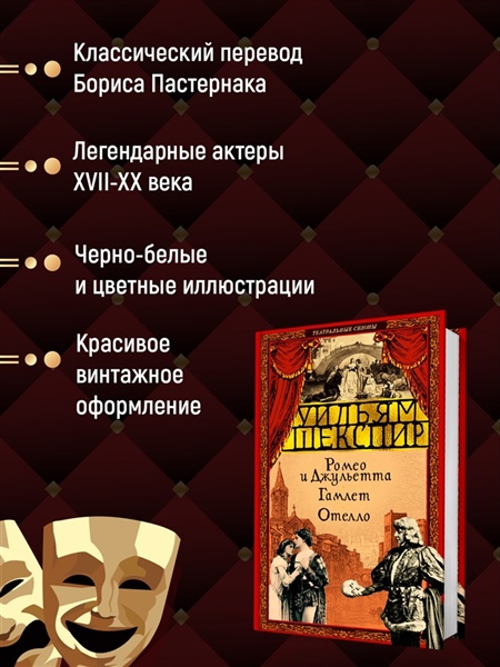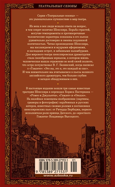 В настоящее издание вошли три самые известные трагедии Шекспира в переводах Бориса Пастернака — «Ромео и Джульетта», «Гамлет» и «Отелло». На вклейках помещены изображения (картины, гравюры и фотографии) зарубежных и русских актеров, известных своими ролями в постановках шекспировских пьес: от Ричарда Бербеджа, первого исполнителя роли принца Датского, до «яростного Гамлета» Владимира Высоцкого.