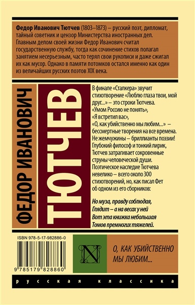 В финале "Сталкера" звучит стихотворение "Люблю глаза твои, мой друг..." — это строки Тютчева. "Умом Россию не понять", "Я встретил вас", "О, как убийственно мы любим..." — бессмертные творения на все времена. Не жемчужины — бриллианты поэзии! Глубокий философ и тонкий лирик, Тютчев затрагивает сокровенные струны человеческой души. Поэтическое наследие Тютчева невелико — всего около 300 стихотворений, но как писал Фет об одном из его сборников: Но муза, правду соблюдая, Глядит — а на весах у ней Вот эта книжка небольшая Томов премногих тяжелей.
