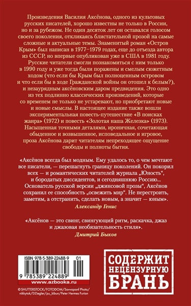 Произведения Василия Аксёнова, одного из культовых русских писателей, хорошо известны не только в России, но и за рубежом. Не один десяток лет он оставался голосом своего поколения, откликаясь блистательной прозой на самые сложные и актуальные темы. Знаменитый роман «Остров Крым» был написан в 1977–1979 годах, еще до отъезда автора из СССР, но впервые опубликован уже в США в 1981 году. Русские читатели смогли познакомиться с ним только в 1990 году и уже тогда были поражены и смелым сюжетным ходом (что если бы Крым был полноценным островом и что если бы в ходе Гражданской войны он отошел к белым?), и незаурядным аксёновским даром предвидения. Это одно из тех подлинно классических произведений, которые со временем не только не устаревают, но приобретают новые и новые смыслы. В настоящее издание также вошли экспериментальная повесть-путешествие «В поисках жанра» (1972) и повесть «Золотая наша Железка» (1973). Насыщенная точными деталями, ироничная, сочетающая обыденное и возвышенное, исповедальное и игровое, проза Аксёнова дарит читателям непреходящее ощущение свободы и полноты бытия.