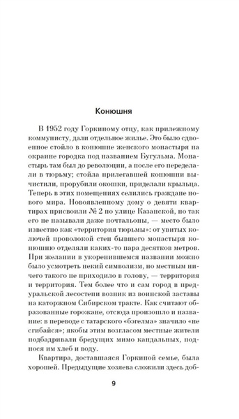 В 1952 году маленький Горка с родителями наконец переезжает в отдельное жилье. Квартира — на самом деле сдвоенное стойло в конюшне женского монастыря на окраине Бугульмы. Монастырь переделали в тюрьму, а стойла прилегавшей конюшни — в квартиры. Бугульма становится для Горки прообразом большого мира. Здесь он будет взрослеть, заводить друзей, влюбляться, делать глупости и совершать благородные поступки. «Территория тюрьмы» — именно так называют этот дом сами жители — в действительности становится для ребенка, а затем молодого взрослого местом, где он учится быть по-настоящему свободным. Этот роман — история взросления на фоне важных событий: смерть Сталина, разоблачение культа личности, полет Гагарина в космос, шестидесятничество. В этой книге удивительным образом сочетается размеренное дыхание большой истории, как в романе «Ложится мгла на старые ступени», и обаяние «пацанской» романтики, как в «Слове пацана».