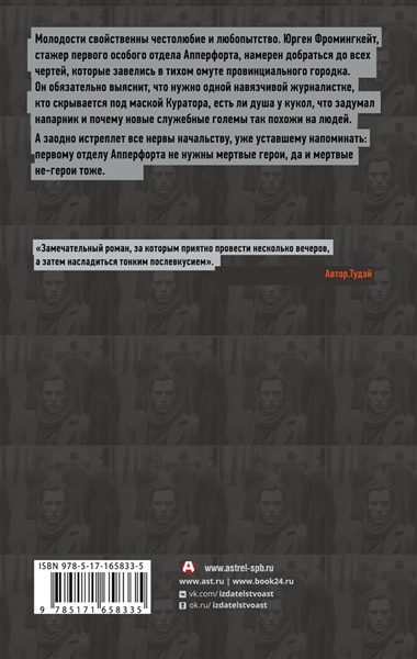 Молодости свойственны честолюбие и любопытство. Юрген Фромингкейт, стажер первого особого отдела Апперфорта, намерен добраться до всех чертей, которые завелись в тихом омуте провинциального городка. Он обязательно выяснит, что нужно одной навязчивой журналистке, кто скрывается под маской Куратора, есть ли душа у кукол, что задумал напарник и почему новые служебные големы так похожи на людей.