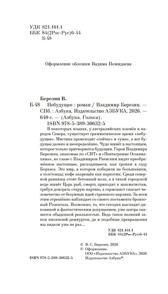 В некоторых языках, у австралийских племён и народов Севера, существует грамматическое время «небудущее». Мистика происходит «сейчас» и «уже», а вот будущее далеко и неопределённо. Чудо живёт в настоящем, которое только притворяется будущим. Герои Владимира Березина, знакомые по «СНТ» и «Пентаграмме Осоавиахима», во главе с Владимиром Раевским видят преображённое настоящее, расходящееся, как тропки в саду Борхеса. Это мир, в котором победили не большевики, а толстовцы; кофе запрещён как наркотик. Среди северной равнины стоит бетонный волк, а в тихой городской воде живёт Царь рыб, смерть приходит к шахматистам, требуя доиграть старую партию, а гармонист спасает человечество от безумных идей страшного карлика. За всем этим отрешённо наблюдает со своего постамента бронзовый Розенталь. Возможно, то, что сегодня выглядит диковиной и фантастическим допущением, уже завтра окажется обыденной реальностью. Ведь таков великий закон писателей-демиургов, да и подобные превращения мы видели уже не раз…