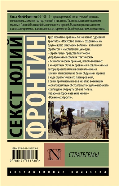 Секст Юлий Фронтин (30-103 гг.) — древнеримский политический деятель, полководец, администратор, ученый и писатель. Тацит называл его "великим мужем", Плиний Младший был в числе его друзей, Марциал упоминал о нем в своих эпиграммах, а для военных историков он был безусловным авторитетом. Труд Фронтина сравним по значению с древним трактатом "Искусство войны", созданным на другом краю Ойкумены великим китайским стратегом и мыслителем Сунь-Цзы. "Стратегемы" представляют собой упорядоченный сборниктактических и психологических приемов, использованных в конкретных случаях древними и современными автору правителями и военачальниками. Причем эти приемы не были обдуманы заранее в ходе стратегического планирования, а были применены из-за внезапно возникших неблагоприятных обстоятельств с целью избежать их или даже обернуть себе на пользу. Недаром второе название книги - "Военные хитрости".