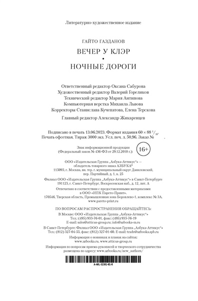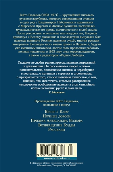 Гайто Газданов (1903–1971) — крупнейший писатель русского зарубежья, которого современники ставили в один ряд с Владимиром Набоковым и сравнивали с Марселем Прустом и Иваном Буниным, восхищаясь музыкальностью его прозы, поэтичностью и силой языка. После революции, в неполные шестнадцать лет, Газданов примкнул к Белому движению и впоследствии вынужден был навсегда покинуть Россию, разделив судьбу многих русских эмигрантов. Большую часть жизни провел в Париже и, будучи уже именитым писателем, долгие годы продолжал работать ночным таксистом; в 1953 году стал корреспондентом, а затем и редактором «Радио Свобода».В настоящее издание включены наиболее значимые произведения Гайто Газданова: «Вечер у Клэр», первый роман, который принес автору известность и открыл перед ним двери ведущих литературных журналов, а также романы «Ночные дороги», «Призрак Александра Вольфа», «Возвращение Будды», избранные рассказы, написанные в разные годы жизни.