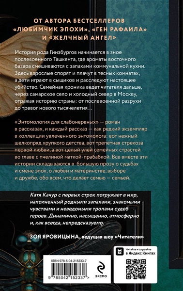 Новинка от Кати Качур — известной российской журналистки и автора бестселлеров «Любимчик Эпохи», «Ген Рафаила» и «Желчный Ангел». История рода Гинзбургов начинается в зное послевоенного Ташкента, где ароматы восточного базара смешиваются с запахами коммунальной кухни. Здесь взрослые спорят и плачут в тесных комнатах, а дети играют в сыщиков и расследуют настоящее убийство. Семейная хроника ведет читателя дальше, через самарское село и холодный север в Москву, отражая историю страны: от послевоенной разрухи до тревог нового тысячелетия.... «Энтомология для слабонервных» — роман в рассказах, и каждый рассказ — как редкий экземпляр в коллекции увлечённого энтомолога: вот нежный шелкопряд хрупкого детства, вот трепетная стрекоза первой любви, а вот целый улей семейных страстей во главе с пчелиной маткой-прабабкой. Здесь детективные тайны раскрывают дети, деревенская идиллия хранит отголоски войны, а тихая лирика отзывается глубокой драмой. Все вместе эти истории складываются вбольшую прозу о судьбах и смене эпох, о любви и материнстве, выборе и дружбе, обо всем, что делает семью — семьей.